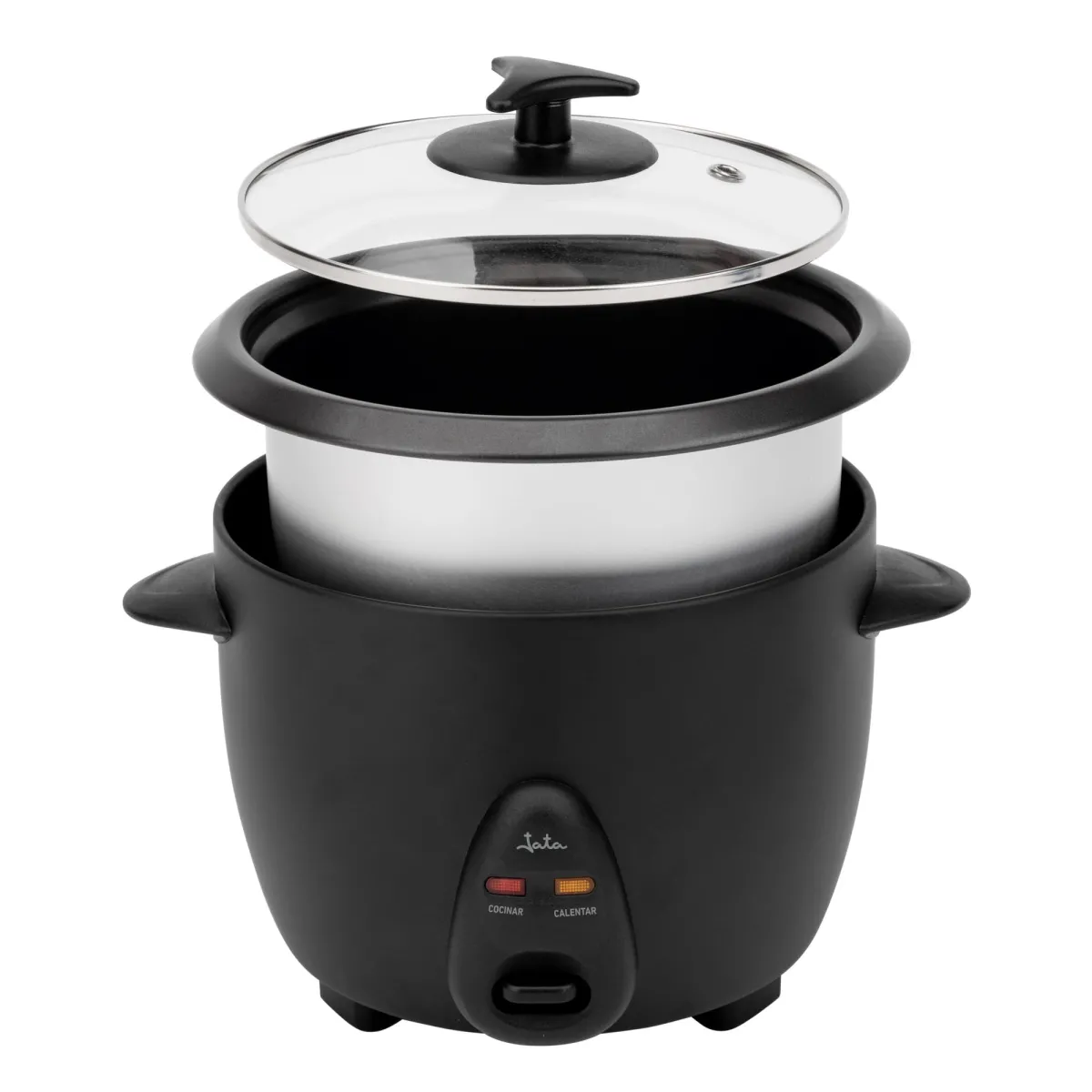 Arrocera eléctrica programable con jarra medidora y espátula incluídas. Cocina arroces especiales y deliciosos Selector de programas: cocción / mantenimiento de calor Cambio automático de función Depósito de aluminio extraíble antiadherente Accesorios incluídos