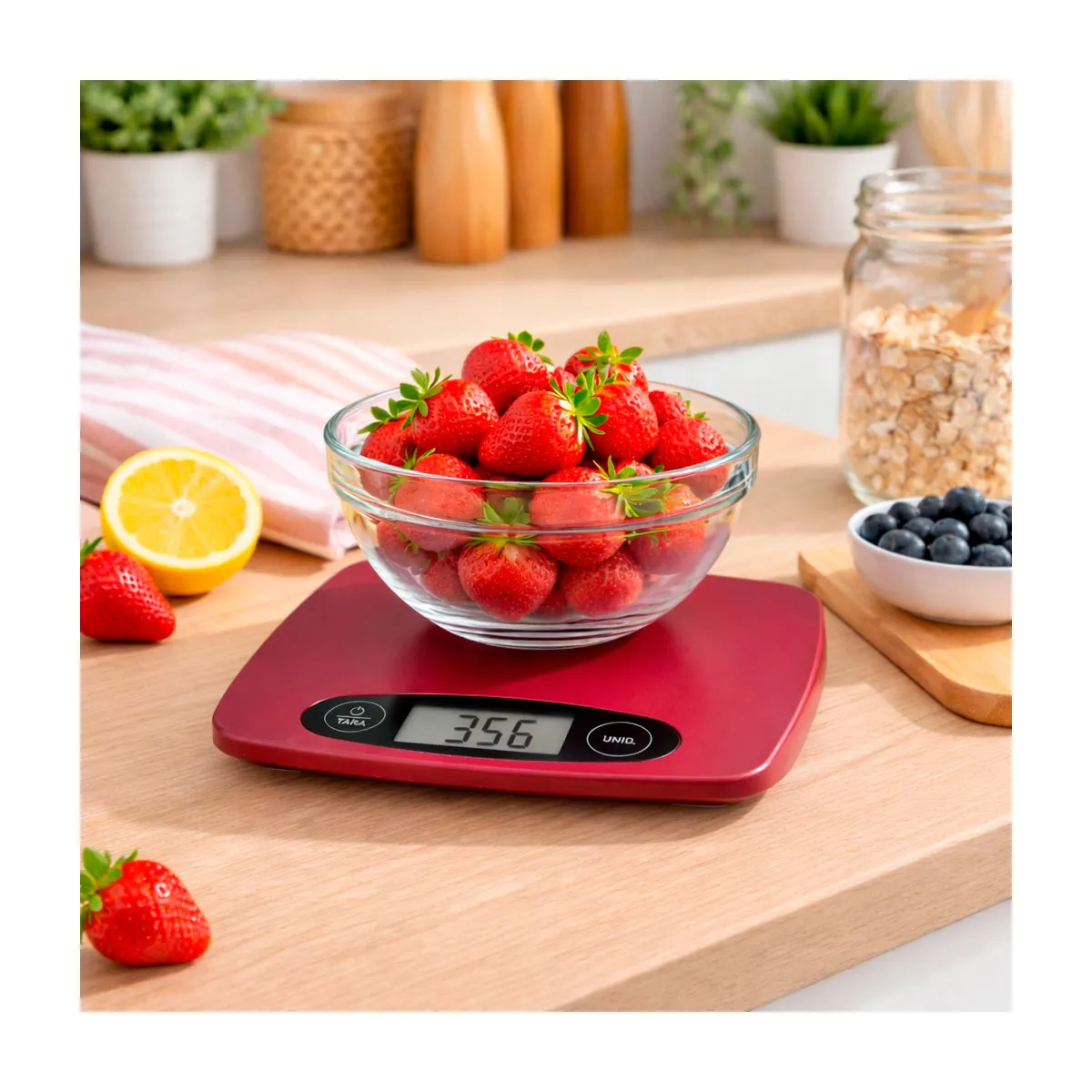 La colorida balanza de cocina HBAL7240 te permite pesar cualquier ingrediente sobre su superficie redonda, llegando a poder poner sobre su superficie hasta 5 kg Capacidad 5 kgPulsadores táctilesFunción de taraVisor "LCD"