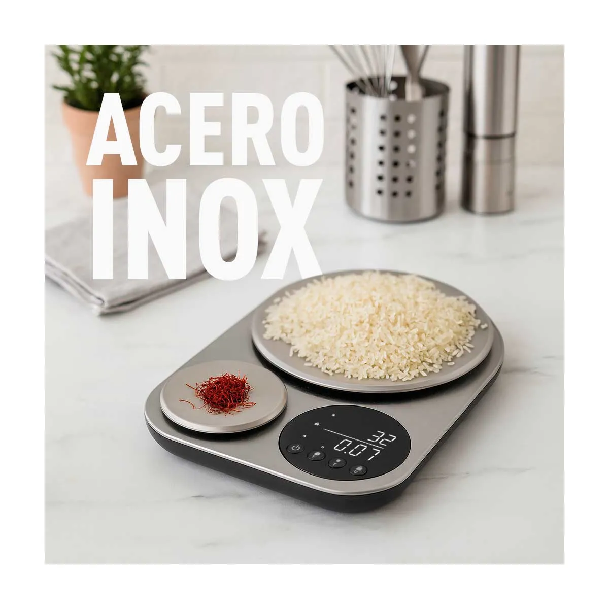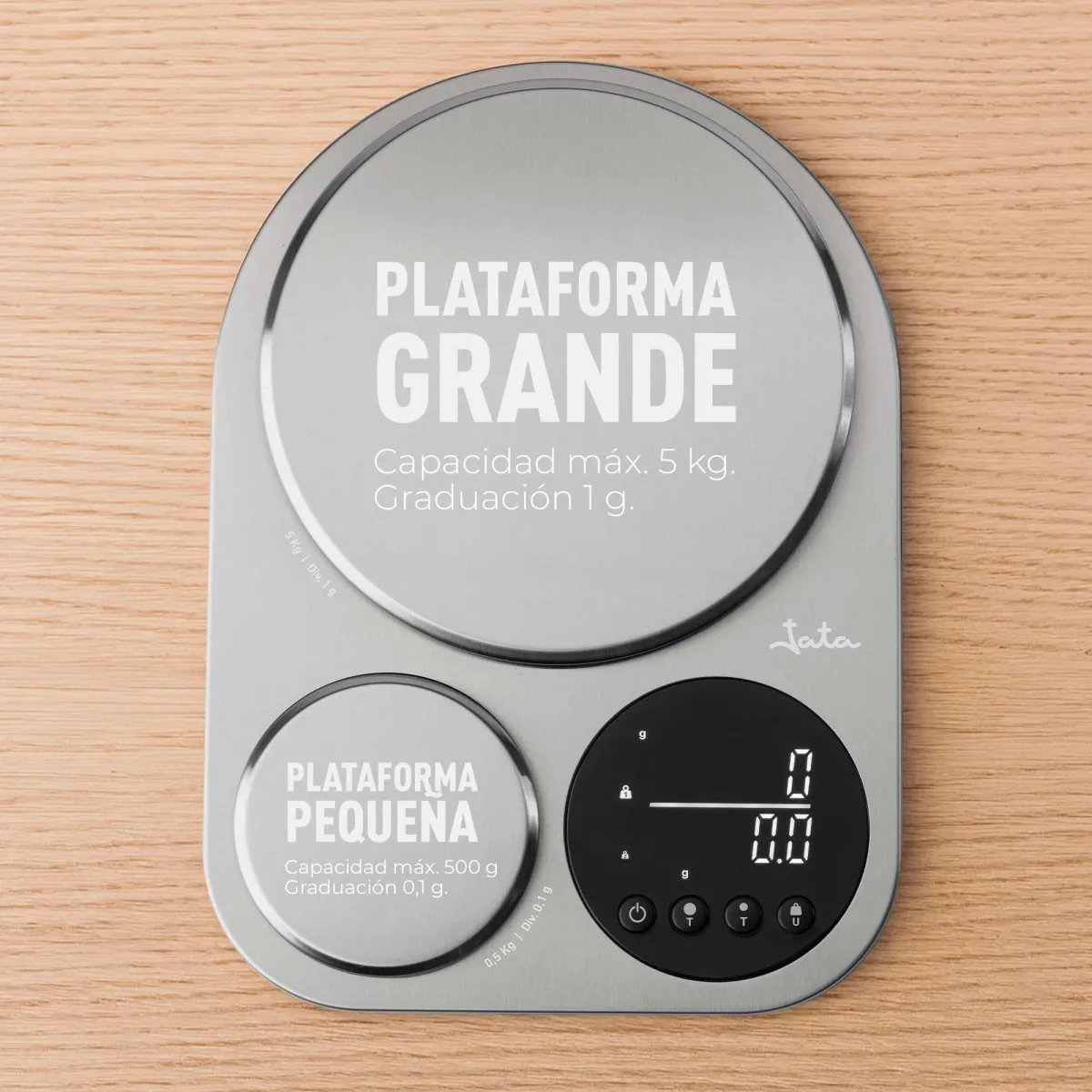 Balanza de alta precisión electrónica con pulsadores táctiles. Informa: peso, volumen agua, volumen leche.Capacidad 5 kg.Visor “LCD” autoluminiscente.