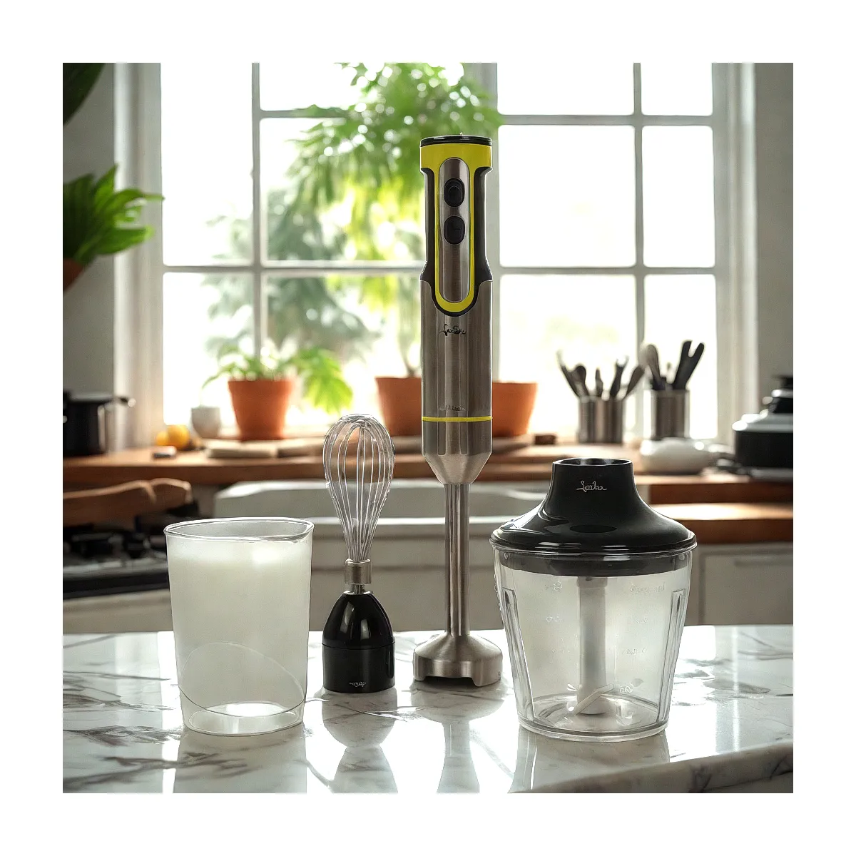 900 W de potencia, regulador electrónico de velocidad y doble cuchilla. Con la batidora BT175 de Jata conseguirás un batido rápido y sin esfuerzo Pie de acero inoxidable desmontable Pulsador de seguridad Asa ergonómica Incluye vaso