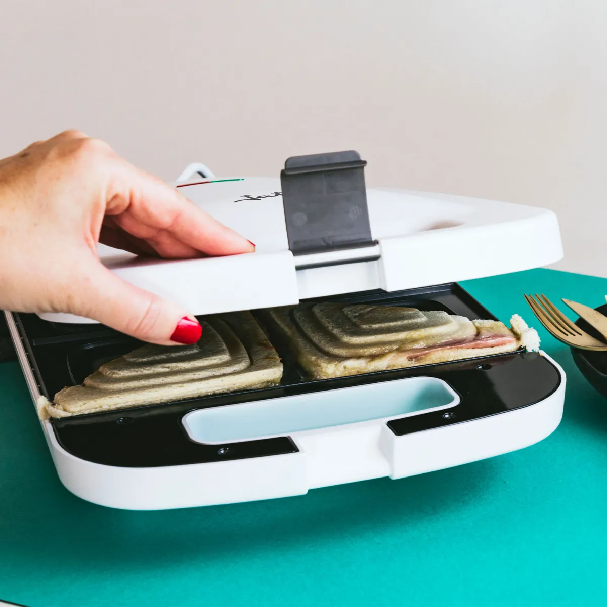 La sandwichera SW546 tiene una potencia de 1.500 W con capacidad para cuatro sándwiches 4 sándwiches enteros Placas con recubrimiento antiadherente Sellado perfecto Fácil limpieza