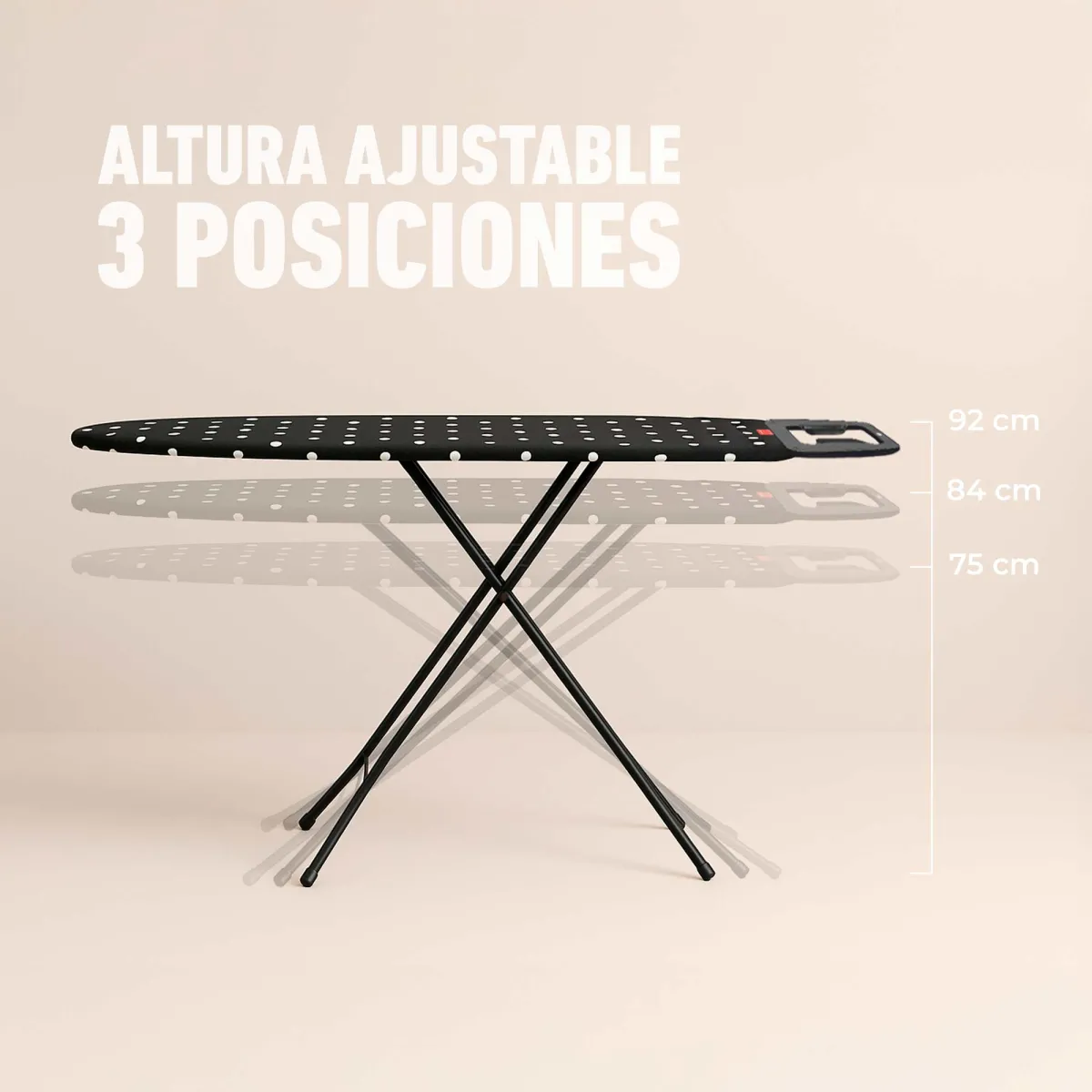 Estructura termolacada con alta resistencia a la oxidación y altura ajustable multiposiciones. Superficie de planchado 116 x 35 cm Sistema de cierre de seguridad Diseño de patas en “Y”, alta estabilidad Patas antideslizantes